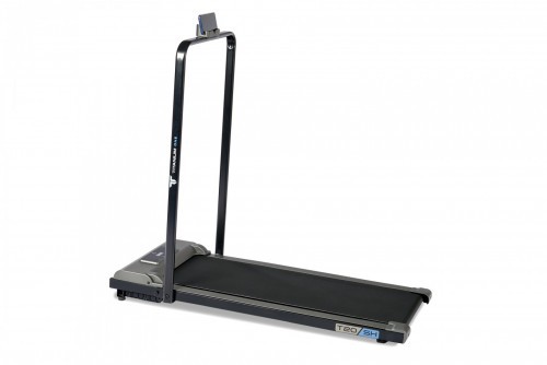Безусловными преимуществами электрической беговой дорожки Titanium One T20 SH являются компактные размеры и демократичная стоимость. Несмотря на то, что тренажер относится к базовому классу оборудования, он закрывает все основные потребности пользователей начального и среднего уровня. За движение отвечает надежный двигатель американской Leeson Electric мощностью 1.25 л.с. постоянного тока. Скорость регулируется в диапазоне от 1 до 8 км/ч - на максимуме этого вполне хватает для бега трусцой. Размеры бегового полотна составляют 100 см. в длину и 38,5 см. в ширину - этого достаточно для ходьбы и бега с небольшой скоростью. Несмотря на сравнительно небольшие размеры бегового полотна, тренироваться на Titanium One T20 SH может пользователь любого роста вплоть до 2-ух метров, но есть ограничение по максимальному весу пользователя - 100 кг. Если вес превышает это значение, следует обратить внимание на модели уровнем выше. Амортизационная система представлена 4-мя плоскими эластомерами и 2-мя небольшими амортизаторами по краям деки. Это совсем простая форма амортизации – для создания дополнительной мягкости лучше заниматься на ковре или специально предназначенном для этого полиуретановом коврике для фитнес оборудования. Titanium One T20 SH требует минимум места для использования и хранения. В рабочем состоянии размер тренажера составляет 122 см. в длину и 56 см. в ширину – даже в самой малогабаритной квартире легко найдется место для тренировки. В сложенном виде толщина беговой дорожки составляет всего 13 см., ее можно положить под кровать или прислонить к стене в горизонтальном виде. Стойки консоли крепятся на 2-ух винтах, процесс сборки и разборки займет около минуты. Учитывая вес дорожки всего в 21 кг. и наличие транспортировочных роликов, переместить тренажер не составит труда даже хрупкой девушке. Тренироваться на беговой дорожке можно как с поручнями, так и без. Поручни помогают не только удерживать равновесие - они также оборудованы держателем для мобильных устройств, куда можно установить смартфон или планшет. Это приятная опция - сериал или музыка отлично помогают справиться с рутиной и однообразием тренировок. Тренировочный компьютер представляет собой LED дисплей c яркими голубыми светодиодами. Он встроен в кожух моторного отсека и показывает такие параметры как скорость, дистанцию, время и сожженные калории. Здесь также есть 3 программы обратного отчета, когда тренировка заканчивается по достижении целевого показателя (дистанция, время или калории). Управление всеми функциями консоли происходит через пульт дистанционного управления. Отдельно стоит сказать об интеграции Titanium One T20 SH со сторонними приложениями, существенно расширяющими возможности тренировки. Первое приложение – Fitshow – является полностью бесплатным. Fitshow предоставляет набор дополнительных тренировочных программ, сохраняет и анализирует статистику. Здесь можно соревноваться с другими пользователями, создать сообщество и добавить друзей, поделиться результатами в соцсетях. При желании можно управлять тренажером прямо со своего смартфона. Если Вы занимаетесь спортом на улице – отлично, данные не пропадут и синхронизируются с результатами тренировки на беговой дорожке. Второе высокотехнологичное приложение Zwift является по сути симулятором виртуальной реальности и ориентировано на в