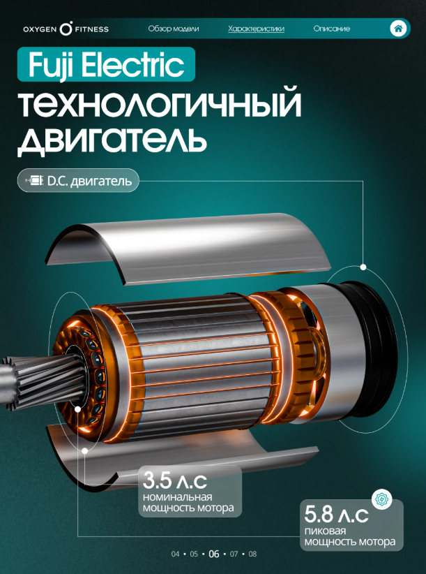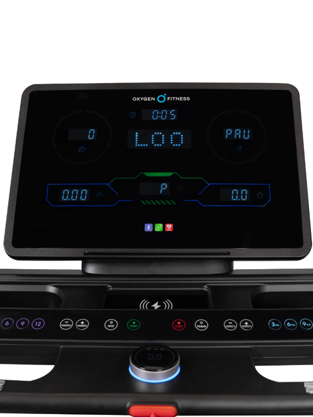 В основе дорожки — массивная высокопрочная рама с антикоррозийной обработкой и двухслойной покраской, рассчитанная на долгий срок службы. Корпус выполнен из ударопрочного полистирола HIPS, устойчивого к механическим нагрузкам. Беговое полотно размером 140 ×52 сми толщиной1,6 ммсоздаёт просторную и безопасную зону для естественного шага и быстрого бега. Парафинированная дека из МДФ толщиной12 ммобеспечивает стабильность и плавность хода. За снижение ударной нагрузки отвечает профессиональная система амортизации на базе 8 динамических эластомеров VCS™, эффективно защищающая суставы и позвоночник даже при высокой интенсивности тренировок. Электронная регулировка угла наклона с 15 уровнями позволяет точно управлять нагрузкой и имитировать бег в гору. OXYGEN FITNESS COPPER оснащена мощным двигателем3.5 л.с. DC Fuji Electric с пиковой мощностью5.8 л.с., обеспечивающим стабильную работу в диапазоне скоростей от 1 до22 км/ч— от разминки до скоростного бега. Консоль и управление: • LED-дисплей с белой индикацией, • отображение: время, скорость, дистанция, калории, пульс, программа, жироанализатор, • сенсорные датчики пульса на поручнях. Программный пакет включает 30 тренировочных режимов: • ручной режим, • 24 предустановленные программы, • 3 пользовательские программы, • 1 пульсозависимую программу, • жироанализатор. Дополнительные возможности: • Bluetooth-колонки для воспроизведения музыки, • Bluetooth для подключения к приложению Fitshow™, • возможность подключения Bluetooth-кардиодатчика, • беспроводная зарядка смартфона, • подставка под планшет или смартфон, • отсеки для аксессуаров. OXYGEN FITNESS COPPER — мощная, технологичная и надёжная беговая дорожка для тех, кто хочет тренироваться дома на уровне профессионального фитнес-клуба.