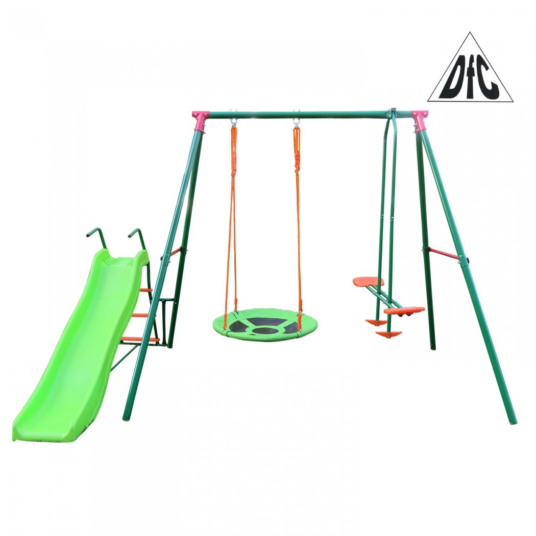 Комплекс включает в себя: двух местные качели, качели - гнездо и горку.