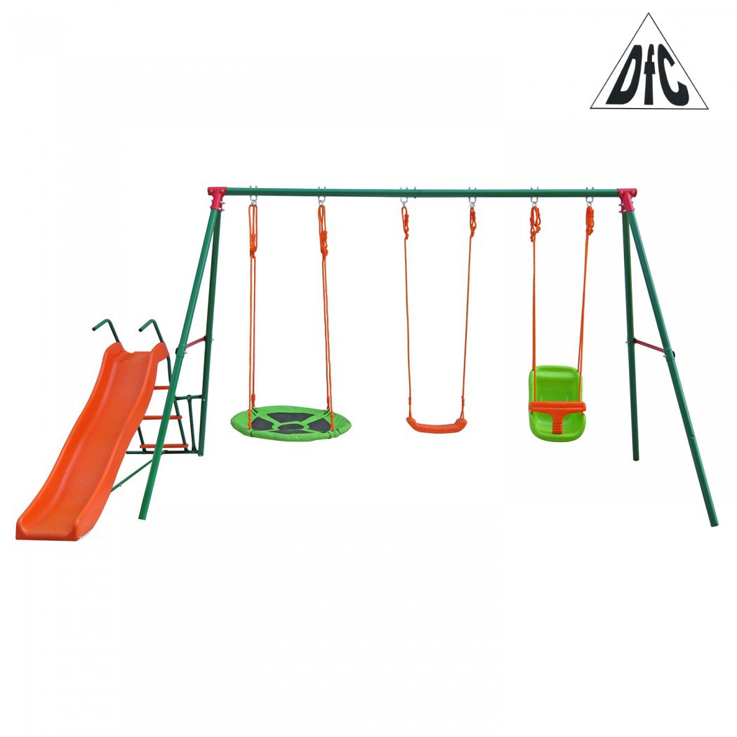 Комплекс включает в себя: веревочные качели, качели - гнездо и качели для детей, и горку.