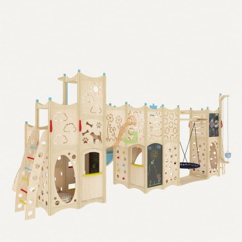 Преимущества игрового сооружения Конструкция состоит из 4 частей, которые объединяются с помощью мостиков, подвесных модулей в виде качелей и т.д. Каждый из них оборудован спортивно-развлекательными модулями: горкой, верёвочной лестницей, лесенкой, качелями, рукоходом, шестом. Верхняя часть конструкции предназначена для спокойного проведения досуга. Например, наверху имеется грифельная доска для юных художников. Также детишки могут организовать ролевую игру, воображая, что они находятся на корабле, башне или высокой горе. Шест – идеальный предмет для игры в «Пожарного» или «Спасателя». Дети не только могут весело проводить время в игровом домике IgraGrad 15, но и незаметно для себя развивать: правильную осанку и координацию движений; ловкость и быстроту; смекалку и мелкую моторику; фантазию и воображение. Также малыш найдёт себе спокойное место для уединения. Здесь ребёнок с любым сложившимся характером сможет найти себе занятие по душе. Безопасность – главный фактор! Берёзовая фанера и масляная пропитка не содержат токсичных веществ. Риск получения травм сводится к минимуму: отсутствуют острые углы, шероховатые поверхности. Щиты конструкции соединятся с помощью надёжных крепежей. Купите домик IgraGrad 15 и дарите незабываемую радость подрастающему поколению. Габариты: Длина площадки: 743,4 см Ширина площадки: 415 см Высота площадки: 313 см