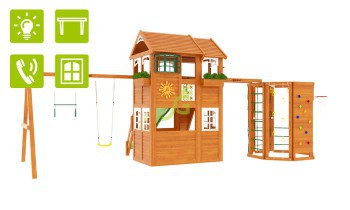 Детская площадка "IgraGrad Клубный домик 2 с WorkOut Luxe" Детская площадка для улицы – целый развлекательный комплекс, который должен решать ряд определённых задач. Для малышей они должны обладать ярким дизайном для правильного психического развития, а для деток постарше важно наличие конструктивных элементов для игр. Ни в коем случае нельзя упускать функциональность игрового сооружения – он должен быть полезен для детей разных возрастов. Именно таким качеством обладает детская площадка IgraGrad Клубный домик 2 с WorkOut Luxe, которую можно купить для установки на даче, во дворе детского сада, школы. Особенности и преимущества детской площадки от компании IgraGrad Детский игровой комплекс представлен в виде двухуровнего игрового домика с дверью, окнами. Его дополнительными элементами являются многогранная шведская стенка, качельный модуль. Сооружение оборудовано многочисленными спортивно-игровыми атрибутами: горкой, скалодромом, канатом, рукоходом, качелями, верёвочной лестницей и другими элементами для организации сюжетно-ролевой игры. Детская площадка преимущественно изготовлена из дерева. При работе с природным материалом учитываются следующие требования: - Поверхности деревянных деталей отшлифованы, что предотвращает появление заноз в нежной коже детишек. - Производство основано на применении современных технологий. - Пропитка деревянных конструкций производится стойкими нетоксичными лакокрасочными составами на водной основе. - Древесина имеет низкую теплопроводимость, поэтому в любое время года детям будет приятно приводить время на такой площадке. Детская Площадка IgraGrad Клубный домик 2 с WorkOut Luxe – это место, где дети будут физически развиваться, бурно обсуждать свои фантазии, воплощать в реальность плоды своего воображения, учиться взаимодействовать друг с другом! Пожалуйста, подумайте об этом и сделайте правильный выбор!. Детская площадка для дачи "IgraGrad Клубный домик 2 с WorkOut Luxe" включает: - Закрытый двухуровневый игровой домик с дверью, деревянной крышей; - деревянное кашпо; - пластиковые окошки; - игровой столик; - фонарики на солнечных батареях; - декоративное солнышко; - волновая горка 3 м; - деревянная лестница с перилами; - скалодром - 2 шт.; - канат; - качельный модуль; - пластиковые одиночные качели (1 шт.); - трапеция с кольцами (1 шт.); - доска для игры в “Крестики-нолики”; - комплект фурнитуры; - руководство по сборке - баскетбольное кольцо со щитом; - "обезьянья тропа"; - элемент шведской стенки; - веревочная лестница; - стена альпиниста; - скалодром с канатом для восхождения; - руководство по сборке Габариты игрового комплекса для детей составляют: - длина, м: 8,54 - ширина, м: 4,2 - высота, м: 3,4 - высота платформы, м: 1,5 Размеры упаковки: - упаковка: 200*200*3000, 3 шт., 136,80 кг. - упаковка: 180*180*2800, 2 шт., 103,42 кг. - упаковка: 250*300*1410, 1 шт., 40,19 кг. - упаковка: 45*700*2800, 2 шт., 39,20 кг. - упаковка: 45*1300*2800, 4 шт., 139,20 кг. - упаковка: 350*500*500, 2 шт., 30,00 кг. - упаковка: 25*700*1000, 1 шт., 6,00 кг. - горка: 300*500*2900, 1 шт., 12,00 кг. (транспортировка только в жёсткой упаковке!) Общий вес: 506,81 кг. Общий объём: 2,146 м3 !