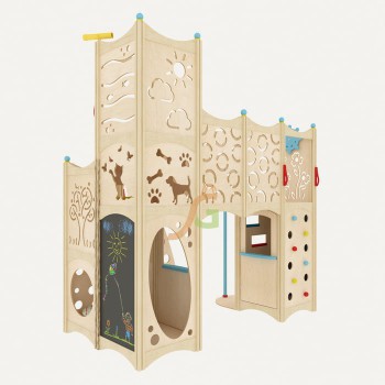 Крепкое здоровье требует физической подготовленности, которая появляется после воздействия на все группы мышц. Игровая конструкция IgraGrad 9 включает все необходимые спортивно-развлекательные элементы, направленные на всестороннее развитие подрастающего поколения: Шест для спуска со второго уровня; Лесенка в виде специальных выемок на щите; Скалодром; Мостик, который соединяет вместе две части сооружения. Игровой домик предоставляет детишкам возможность лазать, играть в ролевые игры вместе с друзьями, в процессе которых происходит социальное развитие, формирование коммуникативных навыков. Важную роль также играет дизайн сооружения. Щиты декорированы фигурными прорезями. В оформлении чувствуется натуральность материала благодаря сохранённой структуре древесного рисунка, чётко просматривающегося через масляную пропитку. Чтобы взрослые были убеждены в безопасности малышей, приведены следующие преимущества берёзовой фанеры: Толщина материала 15 мм; Специальная нетоксичная пропитка, имеющая сертификат безопасности; Низкий уровень теплопроводности фанеры, благодаря чему ребёнку максимально комфортно проводить время в домике; Отсутствие травмоопасных углов; Гладкая поверхность строительного материала; Отличается устойчивостью к негативным внешним факторам; Не выделяет в воздух вредные вещества; Характеризуется прочностью и надёжностью; Сборка происходит по принципу конструктора с применением необходимых крепёжных деталей. С IgraGrad 9 гарантирует прекрасное состояние здоровья и великолепное настроение! Габариты: Длина площадки: 284,5 см Ширина площадки: 145,5 см Высота площадки: 313 см