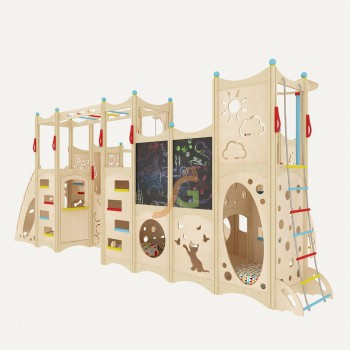 Стоимость площадки указана при изготовлении модулей из березовой фанеры сорта 2/2. При необходимости, можем изготовить городок из березовой фанеры высшего сорта 1/1, стоимость: 771 200 руб. Организовать досуг детишек в общественных местах – задача не из лёгких. Для этого недостаточно разместить игрушки, установить качели и горку. Ведь ребята жаждут приключений! Подходящий вариант – установка большого игрового домика IgraGrad 14! Чем хорош детский домик? Сооружение с многочисленными спортивно-развлекательными модулями поможет создать идеальное место для активного досуга, который будет дополняться общением со сверстниками, социальной адаптацией. Данная конструкция не обладает мобильностью: она требует приличную площадь для установки. Но, поверьте, оно того стоит! Настоящий детский дворец с лабиринтом внутри придётся по душе маленьким капризулям. Они будут проводить в нём уйму времени, развивая: координацию движений; ловкость и выносливость; смекалку, ведь, чтобы выбраться из лабиринта, нужно подумать; коммуникативные навыки; фантазию и воображение в процессе игровых игр; мелкую моторику, рисуя на грифельной доске. Игровая конструкция включает все модули, необходимые для укрепления всех групп мышц, социального развития малышей. Им даже целого дня не хватит, чтобы изучить этот сказочный игровой замок. Взрослые могут быть уверены в безопасности своего крохи: прочность берёзовой фанеры – выше всяких похвал. Даже неугомонное любопытство детишек не причинит изделию серьёзный вред. Безопасная эксплуатация полностью подтверждается тщательной обработкой краёв, поверхностей деталей. Сооружение собирается как конструктор – из готовых щитов и устанавливается, как вдоль стены, так и по центру комнаты. Габариты: Длина площадки: 615,5 см Ширина площадки: 156,5 см Высота площадки: 247 см