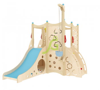 Домик для малышей IgraGrad 7 станет поистине той маленькой территорией, которую они будут самостоятельно обустраивать, устанавливать свои правила. Очень часто проблемы с психикой у детей бывают из-за того, что им негде проявить свою самостоятельность, чувство ответственности. Поэтому вы не пожалеете, если купите своему чаду красивый, многофункциональный игровой комплекс, который устанавливается в любом месте комнаты: вдоль стены, по центру или в углу. Мы рекомендуем модель для обустройства игровых помещений в общественных учреждениях. Поверьте, если в вашем кафе или сетевом магазине будет отведён уголок с данным игровым комплексом, то визит клиентов увеличится в несколько раз. Гарантируем, пока вы занимаетесь своими делами, ваш малыш скучать не будет! Из чего состоит игровой комплекс? Оптимальное количество составных элементов направлено в первую очередь на физическое развитие крохи: Лазая по выступающим и вырезным элементам, ребёнок улучшает состояние всех групп мышц, способствует развитию выносливости, ловкости и формирует новые навыки движений; Спуски с горки поднимают настроение; Верхняя часть может служить в качестве стены, палубы корабля. Всё зависит от фантазии родителей и маленького пользователя; Внизу детишки могут уединяться, читать книгу, обустроить место для дневного сна. Можно приобрести дополнительные игровые модули. Фанера из берёзы – основной материал игрового комплекса. Эстетичный внешний вид ему придаёт масляная пропитка на нетоксичной основе. Все углы сглажены, поэтому риск получить травму сводиться к минимуму. Габариты: Длина площадки: 289,5 см Ширина площадки: 203,5 см Высота площадки: 247 см