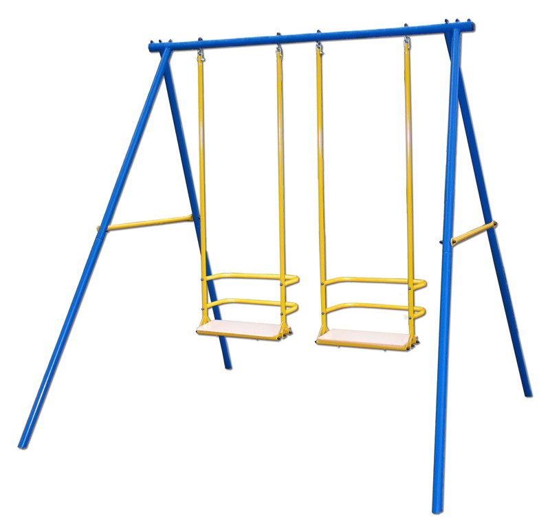 Компактная конструкция включает в себя А-образные металлические стойки, снабженные двумя одноместными качелями. В целях надежности качели оборудованы спинкой, что позволяет безопасно раскачиваться на них даже малышам.