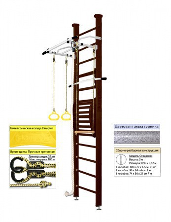 Домашний спортивный комплекс Kampfer Helena Maxi Ceiling Артикул: Helena Maxi Ceiling Домашний спортивный комплекс Kampfer Helena Maxi Ceiling Детский спортивный комплекс ДСК Kampfer Helena Maxi Ceiling это дополненная версия одной из самых популярных моделей из линейки деревянных ДСК Kampfer. Распорная шведская стенка Helena Maxi теперь в новой цветовой гамме, что позволяет подобрать нужный оттенок под дизайн помещения. Модель Kampfer Helena Maxi Ceiling включает в себя набор из самых популярных навесных аксессуаров канат, кольца и трапецию, а также тренажер для спины Kampfer Posture Wall. Правильная осанка - сделает Ваше тело красивым, формы фигуры приобретут гармонию походка станет привлекательной, обретет легкость и грациозность - достойные восхищения. А Вы обретете уверенность в себе - гармонию души и тела. Добиться стройной фигуры с тренажерами Kampfer легко! Модель Kampfer Helena Maxi Ceiling включает в себя тренажер для спины Kampfer Posture. Тренажерный комплекс Kampfer Posture предназначен для занятий физическими упражнениями, позволяющими расслаблять, разминать и массировать мышцы спины в домашних условиях. Kampfer Posture это тренажер для улучшения осанки, поэтому в первую очередь необходимо привлечь к занятиям подростков, и даже маленьких детей. Им неприменно понравиться занятия на тренажере под Вашим руководством и присмотром. При помощи различных упражнений на Kampfer Posture Вы сможете укрепить мышцы спины и многие другие группы мышц. Регулярные занятия очень полезны для Вашего здоровья. Уделяя им по 15-20 минут в день Вы сами почувствуете как в скором времени окрепнет Ваше тело и выпрямится осанка. Домашний тренажер Kampfer Posture - станет прекрасным подарком для детей. Kampfer Posture подходит для детей в возрасте от 4 лет и рекомендован для установки в домашних условиях и в детских учреждениях. Конструкция была выполнена из натурального дерева, все края деталей немного скруглены, места креплений болтов закрыты декоративными пластиковыми заглушками обеспечивая большую безопасность для ребенка. Крепление: Турник и тренажер для спины Kampfer Posture могут устанавливаться на деревянную шведскую стенку Kampfer на нужной высоте. Для напольных занятий тренажер также может быть установлен на ровную поверхность пола. Устойчивость тренажера Kampfer Posture обеспечивают специальные крепежные выемки по бокам тренажера, а относительно небольшие вес и размеры позволяют с легкостью передвигать тренажер с места на место и убирать на хранение. Конструкция выполнена из натурального дерева, все края деталей немного скруглены обеспечивая большую безопасность для ребенка. Крепление враспор между потолком и полом удобно тем, что подходит для любых стен, и комплекс можно передвигать с места на место. Но потолок не должен быть из хрупких материалов, таких как гипсокартон (навесные) и вагонка, для них лучше подойдут пристенные модели. Комплектация: — турник — шведская стенка — канат — кольца — трапеция — тренажер Kampfer Posture 2 с турником Для того, чтобы уберечь Ваших детей от ушибов при падениях и прыжках рекомендуем приобрести гимнастический мат. Также обратите внимание на дополнительные аксессуары, такие как брусья, баскетбольное кольцо, качели или наклонная доска, которые превратят Ваш ДСК в спортивный зал для всей семьи. — Новинка! Новая цветовая гамма и высота модели на выбор! — Стандартная комплектация - выберите "Высота Стандарт" - получая высоту 2,67 м — Нови