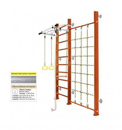Домашний спортивный комплекс Kampfer Winner Wall Артикул: Winner Wall Детский спортивный комплекс ДСК Kampfer Winner Wall это новинка среди моделей из линейки домашних деревянных шведских стенок Kampfer. Модель Kampfer Winner включает в себя набор из самых популярных навесных аксессуаров канат, кольца и трапецию. Крепкий металлический турник выдерживает нагрузку до 120 кг, подходит как детям так и взрослым. Навесное оборудование Kampfer на прочных тросах выдерживает нагрузку до 100 кг. В дополнении к основным аксессуарам в комплектации к Kampfer Winner идет канатный лаз - это прочная сетка шириной 90 см из крепкого шнура выдерживает нагрузку до 100 кг. Стойка с сеткой Kampfer Winner значительно расширяет игровое пространство детской комнаты и позволяет разнообразить функциональность классической шведской стенки Kampfer. Особенностью пристенной шведской стенки Kampfer Winner является восемь креплений к стене, в отличие от обычных пристенных моделей, у которых только четыре крепления. Увеличение количества креплений до восьми обеспечивает самые надежные и максимально безопасные занятия на шведской стенке Kampfer Winner. — Крепление: к стене. Можно использовать для помещений с подвесными и натяжными потолками. Не подходит при хрупких и гипсокартонных стенах, для них лучше подойдут модели с креплением враспор. Комплектация: — турник — шведская стенка — канат — кольца — трапеция — стойка с сеткой Для того, чтобы уберечь Ваших детей от ушибов при падениях и прыжках рекомендуем приобрести гимнастический мат. Также обратите внимание на дополнительные аксессуары, такие как брусья, баскетбольное кольцо, качели или наклонная доска, которые превратят Ваш ДСК в спортивный зал для всей семьи. Характеристики: Комплекс представляет собой сборно-разборную деревянную конструкцию. — Крепление: к стене. — Высота модели "Стандарт": 2,42 м — Ширина шведской стенки(по стойкам): 64 см — Выступ боковых креплений(заглушки): 1-0,7 cм — Общая ширина шведской стенки включая стойку с сеткой и выступ рукоятки турника: 174 см — Ширина cтойки с сеткой: 94 см — Ширина захвата турника(между рукоятками): 95 см — Длина турника(выступ от лестницы): 52 см — Высота турника (от потолка вниз): 37 см — Общая длина выступа от стены(с турником): 70 см — Размер крепления к стене(длина х ширина): 8 х 10 см — Размеры стойки лестницы (длина х ширина): 10 х 4 см — Высота деревянной стойки модели "Стандарт": 2.40 м — Высота нижних кронштейнов-упоров: 2 см — Допустимая нагрузка навесное оборудование: 100 кг — Допустимая нагрузка шведскую стенку: 120 кг — Гарантийный срок: 2 года Размер упаковки: Упаковка Kampfer Winner высота "Стандарт": 1 место (шведская стенка): 242 х 18 х 10 см 20 кг 2 место (турник): 96 х 34 х 4 см 3 кг 3 место (стойка с сеткой): 244 х 20,5 х 11 см 13 кг Общий вес упаковки модели "Стандарт": 36 кг Обратите Внимание! Для сборки и установки пристенной шведской стенки Вам понадобится инструменты для просверливания отверстия в стене - дрель с сверлами диаметром 12 мм (для некоторых особо прочных стен может потребоватся перфоратор). Для установки металлического турника Вам понадобится дрель с сверлами диаметром 10 мм. Для увеличение высоты: Если Вам не подходит стандартная высота шведсвой стенки, то можно приобрести модель спецзаказ 3х метровой высоты. Для уменьшение высоты: При желании, можно подпилить нижние части стоек до нужной высоты и закрыть подпил декоративными опорами. Ин