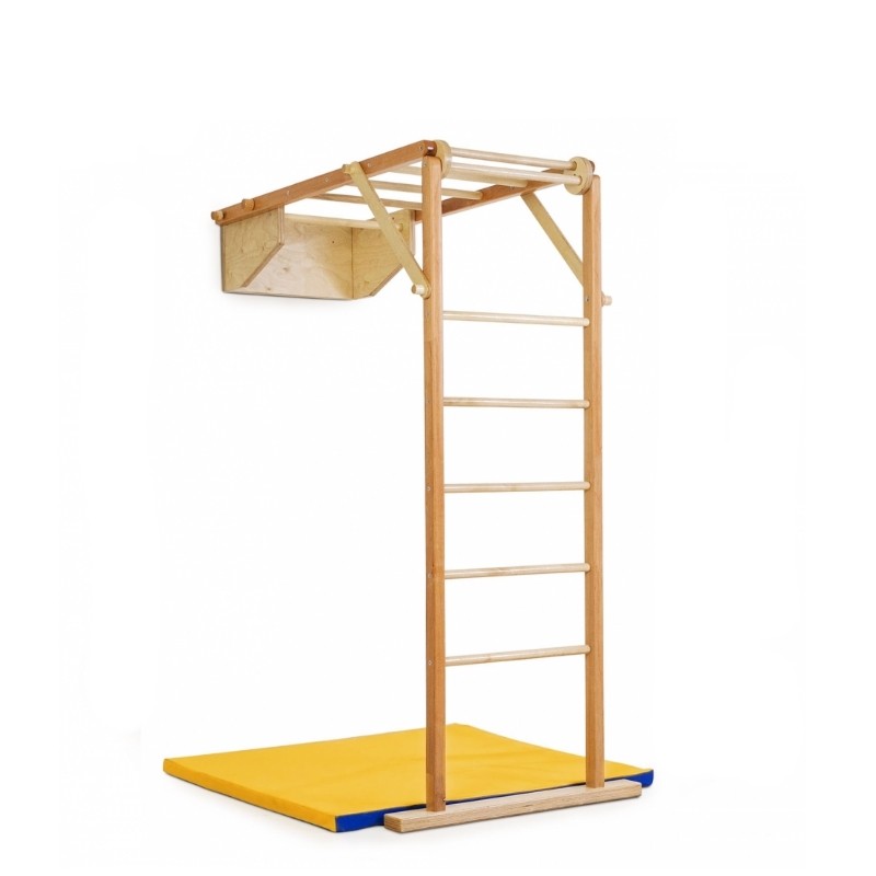 Спортивный уголок по конструкции напоминает обычную шведскую стенку из дерева.Однако уникальная конструкция позволяет максимально расширить возможности простой лестницы! Рукоход и лестница крепятся к стене с помощью небольшого турника и надежно фиксируются специальными крепежами. Лестницы соединены креплением, которое позволяет, с одной стороны, надежно фиксировать спортивный уголок, а с другой, при необходимости быстро его складывать для хранения.