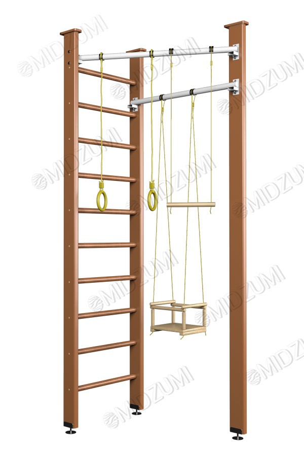 Торговый Дом Midzumi представляет новинку Детский спортивный комплекс Midzumi Ari. Он выполнен из клееного бруса сосны и березы. Способ установки комплекса: крепление враспор. такой вид крепления прекрасно подойдет тем, кто не хочет портить красивые обои и сверлить стены. Крепление враспор между полом и потолком надежно ни чуть не меньше крепления к стене, к тому же такой комплекс при необходимости можно легко перенести на другое место. Обратите внимание, что навесные потолки, и потолки из хрупких материалов не подходят для установки данного комплекса. Midzumi Ari имеет в своей комплектации навесное оборудование: качели, кольца и трапеция .