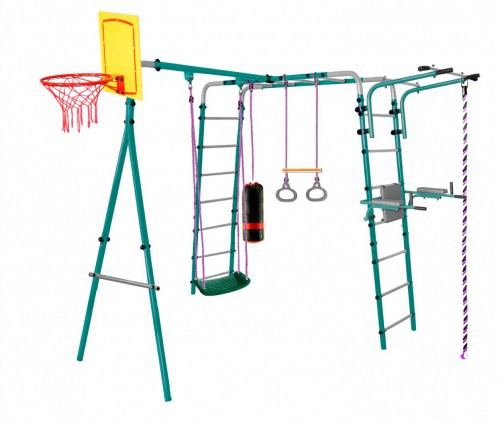 Уличный детский спортивный комплекс Midzumi Hanabi Medium Артикул: Hanabi Medium Торговый Дом Midzumi представляет новинку Уличный Детский спортивный комплекс Midzumi Hanabi Medium в новом цветовом решении - морской бриз. Этот спортивный комплекс показывает разнообразие модельного ряда продукции Midzumi. Прочная металлическая конструкция позволяет выдерживать до 100 кг. Крепление Комплекса осуществляется с помощью бетонирования. Midzumi Hanabi Medium состоит из каркаса двух металлических лестниц с рукоходом, передвижного турника, навесных пластиковых качелей, каната и колец с перекладиной, баскетбольного щита, брусьев откидных со спинкой и детской боксерской грушей. Качественные материалы изготовления надолго сохраняют яркость цвета и рассчитаны на любые погодные условия, устойчивы к попаданию прямых солнечных лучей, морозу, дождю и перепадам температур, прослужат долго даже при самом интенсивном использовании. Пластиковые качели без спинки это облегченный вариант классических качелей наиболее безопасный для детей, а также яркая раскраска и интересный дизайн качелей обязательно понравятся малышу, сможет уместить как дошкольника, так и подростка. Широкое пластиковое сидение качелей изготовлено из современного прочного материала и снабжена водостойким полиамидным шнуром, благодаря чему качели обладают повышенной износостойкостью и позволяют выдерживать максимальную нагрузку до 100 кг. Использование таких качелей подарит отличное настроение и восторг пользователям любого возраста! Детский боксерский мешок-груша создан для детей, которые хотят научиться боксерским приемам - его можно подвесить на удобной высоте на горизонтальную перекладину или турник. Это облегченный вариант классических боксерского мешка с наполнителем синтешар наиболее безопасный для детей, а также удобный и компактный в переноске и хранении. Брусья со спинкой рассчитаны для тренировки многих групп мышц и помогут Вам укрепить спину и руки, накачать пресс, подкачать ноги. Удобная конструкция креплений позволяет регулировать необходимую Вам высоту и складывать брусья после тренировки, компактно размещая их рядом с опорами комплекса. Баскетбольный щит с диаметром кольца: 34 см. Закидывать мяч в корзинку любят все дети, можно играть в одиночку или устраивать соревнования с друзьями и родителями, ведь даже взрослым будет интересна такая игра. Упражнения с мячом способствуют развитию базовых навыков игры в баскетболе, прекрасно тренируют мышцы рук, увеличивая ловкость и внимание, занимают и одновременно физически развивают ребенка, что очень полезно для здоровья. Щит необычайно прочен, обеспечивает длительное и качественное использование. Комплектация: — основа - каркас из металлических лестниц с рукоходом — передвижной турник — подвесные пластиковые качели — канат — кольца с перекладиной — баскетбольный щит — брусья откидные со спинкой — груша боксерская детская Характеристики — В новом цветовом решении - морской бриз — Для детей от 3-х лет и старше — Габариты комплекса(ДхШхВ): 285 х 245 х 245 см — Общая длина (расстояние с выступом турника): 285 см — Ширина комплекса: 245 см — Высота верхних стоек комплекса: 210 см — Высота комплекса с учетом баскетбольного щита: 245 см — Материал стоек качелей: металл — Материал подвесных качелей: пластик — Комплектация: каркас из металлических 