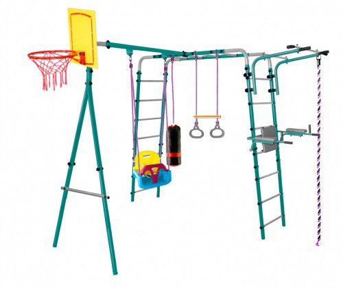Уличный детский спортивный комплекс Midzumi Hanabi Small Артикул: Hanabi Small Торговый Дом Midzumi представляет новинку Уличный Детский спортивный комплекс Midzumi Hanabi Small в новом цветовом решении - морской бриз. Этот спортивный комплекс показывает разнообразие модельного ряда продукции Midzumi. Прочная металлическая конструкция позволяет выдерживать до 100 кг. Крепление Комплекса осуществляется с помощью бетонирования. Midzumi Hanabi Small состоит из каркаса двух металлических лестниц с рукоходом, передвижного турника, навесных пластиковых качелей 3 в 1, каната и колец с перекладиной, баскетбольного щита, брусьев откидных со спинкой и детской боксерской грушей. Качественные материалы изготовления надолго сохраняют яркость цвета и рассчитаны на любые погодные условия, устойчивы к попаданию прямых солнечных лучей, морозу, дождю и перепадам температур, прослужат долго даже при самом интенсивном использовании. Детский боксерский мешок-груша создан для детей, которые хотят научиться боксерским приемам - его можно подвесить на удобной высоте на горизонтальную перекладину или турник. Это облегченный вариант классических боксерского мешка с наполнителем синтешар наиболее безопасный для детей, а также удобный и компактный в переноске и хранении. Брусья со спинкой рассчитаны для тренировки многих групп мышц и помогут Вам укрепить спину и руки, накачать пресс, подкачать ноги. Удобная конструкция креплений позволяет регулировать необходимую Вам высоту и складывать брусья после тренировки, компактно размещая их рядом с опорами комплекса. Баскетбольный щит с диаметром кольца: 34 см. Закидывать мяч в корзинку любят все дети, можно играть в одиночку или устраивать соревнования с друзьями и родителями, ведь даже взрослым будет интересна такая игра. Упражнения с мячом способствуют развитию базовых навыков игры в баскетболе, прекрасно тренируют мышцы рук, увеличивая ловкость и внимание, занимают и одновременно физически развивают ребенка, что очень полезно для здоровья. Щит необычайно прочен, обеспечивает длительное и качественное использование. Пластиковые качели 3в1 это облегченный вариант классических качелей наиболее безопасный для детей, а также яркая раскраска и интересный дизайн качелей 3в1 обязательно понравятся малышу. Качели Midzumi выполнены в форме кресла с высокой съемной спинкой и дополнительным защитным ограничительным поручнем. В дальнейшем, когда ребенок подрастет можно убрать ограничительные поручень и спинку, за счет чего размер сидения увеличится и сможет уместить как дошкольника, так и подростка. Широкое пластиковое сидение качелей изготовлено из современного прочного материала и снабжена водостойким полиамидным шнуром, благодаря чему качели обладают повышенной износостойкостью и позволяют выдерживать максимальную нагрузку до 100 кг. Использование таких качелей подарит отличное настроение и восторг пользователям любого возраста! Три различных варианта сборки качелей для разного возраста: — №1 со спинкой и ограничителем: от 1 до 3-х лет — №2 со спинкой и без ограничителя: от 3 до 5 лет — №3 без спинки и без ограничителя: от 5 лет и старше Комплектация: — основа - каркас из металлических лестниц с рукоходом — передвижной турник — подвесные пластиковые качели 3в1 — канат — кольца с перекладиной — баскетбольный щит — брусья откидные со 