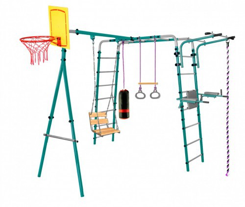Уличный детский спортивный комплекс Midzumi Hanabi Universal Артикул: Hanabi Universal Торговый Дом Midzumi представляет новинку Уличный Детский спортивный комплекс Midzumi Hanabi Universal в новом цветовом решении - морской бриз. Этот спортивный комплекс показывает разнообразие модельного ряда продукции Midzumi. Прочная металлическая конструкция позволяет выдерживать до 100 кг. Крепление Комплекса осуществляется с помощью бетонирования. Midzumi Hanabi Universal состоит из каркаса двух металлических лестниц с рукоходом, передвижного турника, навесных цепных качелей, каната и колец с перекладиной, баскетбольного щита, брусьев откидных со спинкой и детской боксерской грушей. Качественные материалы изготовления надолго сохраняют яркость цвета и рассчитаны на любые погодные условия, устойчивы к попаданию прямых солнечных лучей, морозу, дождю и перепадам температур, прослужат долго даже при самом интенсивном использовании. Детский боксерский мешок-груша создан для детей, которые хотят научиться боксерским приемам - его можно подвесить на удобной высоте на горизонтальную перекладину или турник. Это облегченный вариант классических боксерского мешка с наполнителем синтешар наиболее безопасный для детей, а также удобный и компактный в переноске и хранении. Брусья со спинкой рассчитаны для тренировки многих групп мышц и помогут Вам укрепить спину и руки, накачать пресс, подкачать ноги. Удобная конструкция креплений позволяет регулировать необходимую Вам высоту и складывать брусья после тренировки, компактно размещая их рядом с опорами комплекса. Баскетбольный щит с диаметром кольца: 34 см. Закидывать мяч в корзинку любят все дети, можно играть в одиночку или устраивать соревнования с друзьями и родителями, ведь даже взрослым будет интересна такая игра. Упражнения с мячом способствуют развитию базовых навыков игры в баскетболе, прекрасно тренируют мышцы рук, увеличивая ловкость и внимание, занимают и одновременно физически развивают ребенка, что очень полезно для здоровья. Щит необычайно прочен, обеспечивает длительное и качественное использование. Удобные и надежные подвесные качели Midzumi. Вместительный размер широкого сидения качелей глубина 32 см, ширина 40 см снаружи и 34 см внутри. Подвесные качели Midzumi состоят из подвесного на цепях металлического каркаса качелей с деревянной спинкой и сидением. Это классический вариант металлических качелей с деревянными спинкой и сидением, а также приятная раскраска и интересный дизайн. Широкое деревянное сидение качелей сможет уместить как ребенка, так и взрослого, имеет под собой прочный металлического каркас и для подвеса снабжена металлической цепью, благодаря чему качели обладают повышенной износостойкостью и позволяют выдерживать максимальную нагрузку до 100 кг. Использование таких качелей подарит отличное настроение и восторг пользователям любого возраста! Комплектация: — основа - каркас из металлических лестниц с рукоходом — передвижной турник — подвесные цепные качели — канат — кольца с перекладиной — баскетбольный щит — брусья откидные со спинкой — груша боксерская детская Характеристики — В новом цветовом решении - морской бриз — Для детей от 4 лет и старше — Габариты комплекса(ДхШхВ): 285 х 245 х 245 см — Общая длина (расстояние с выступом турника): 285 см — Ширина комплекса: 245 см — Высота верхних стоек комп