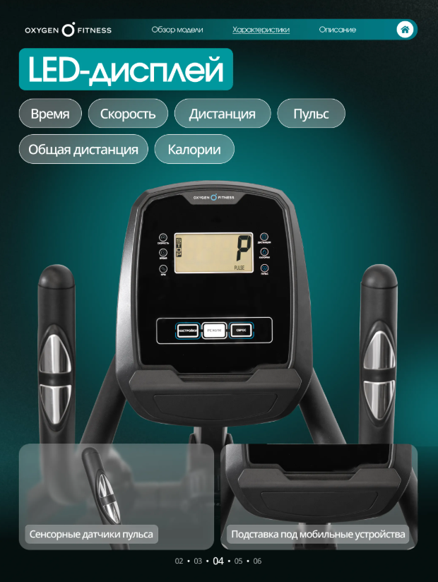 Передний привод, продуманная эргономика и магнитная система нагружения делают ALAMOSA отличным выбором для регулярных кардиотренировок, направленных на развитие выносливости и укрепление всего тела. Тренажёр построен на высокопрочной раме с антикоррозийной обработкой и двухслойной покраской, что обеспечивает устойчивость и долговечность конструкции. Корпус выполнен из ударопрочного полистирола HIPS, устойчивого к износу. Передний привод и инерционный вес маховика24 кг(BioFusion™) обеспечивают ровное, стабильное и естественное движение без рывков. Реальный вес маховика составляет6 кг. Длина шага460 ммподходит для большинства пользователей и позволяет поддерживать комфортную амплитуду движения. Расстояние между педалями — всего80 мм, что снижает нагрузку на колени и тазобедренные суставы. Педальный узел с трёхкомпонентным шатуном повышает надёжность и ресурс тренажёра, а увеличенные антискользящие педали обеспечивают уверенную фиксацию стопы. ALAMOSA использует магнитную систему нагружения с 10 уровнями сопротивления, регулируемыми механически. Это позволяет легко подобрать интенсивность тренировки — от лёгкой кардионагрузки до более энергичных занятий. Тренажёр не требует подключения к электросети, что упрощает установку и эксплуатацию в домашних условиях. Консоль оснащена монохромным LED-дисплеем и отображает основные параметры тренировки: • время, • скорость, • дистанция, • калории, • пульс, • общую дистанцию. Доступные режимы: быстрый старт и ручной режим. Интерфейс поддерживает русский и английский языки. Для контроля сердечного ритма предусмотрены сенсорные датчики пульса на поручнях. Рукоятки двухпозиционные, с нескользящим покрытием. OXYGEN FITNESS ALAMOSA - сбалансированный эллиптический тренажёр для домашних тренировок, сочетающий плавность хода, надёжную конструкцию и комфортную биомеханику для ежедневной работы над выносливостью и формой.