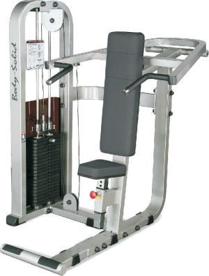 Вертикальный жим сидя. Имеет впечатляющий набор механических и эргономических особенностей. Снимает нагрузку с поясничной части спины, обеспечивает максимальный комфорт. Имеет полностью настраиваемое комфортное сиденье, регулируемое под рост любого пользователя и удобное для занимающихся любой комплекции. Специальная система равномерно распределяет вес. Работающие группы мышц: дельтовидные, трицепс.