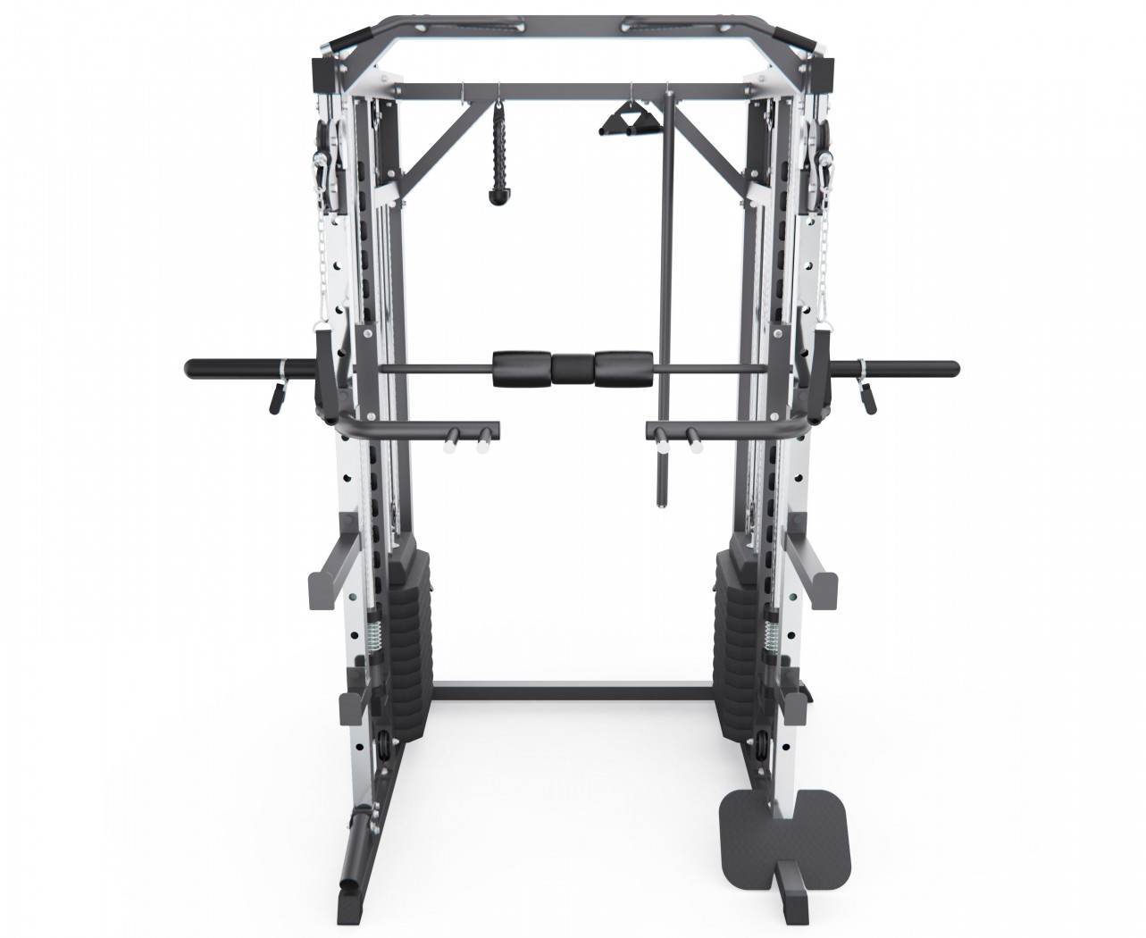 Тренажёр оснащён двумя блоками кроссовера, каждый из которых имеет вес 72 кг, что позволяет точно регулировать нагрузку и эффективно прорабатывать различные группы мышц. Отдельно предусмотрены амортизатор и весовой диск, упор для ног и поручни, что позволяет выполнять тяги, жимы, приседания, проработку спины, рук и корпуса. Турник с широкой перекладиной даёт возможность выполнять множество упражнений на верхнюю часть тела.