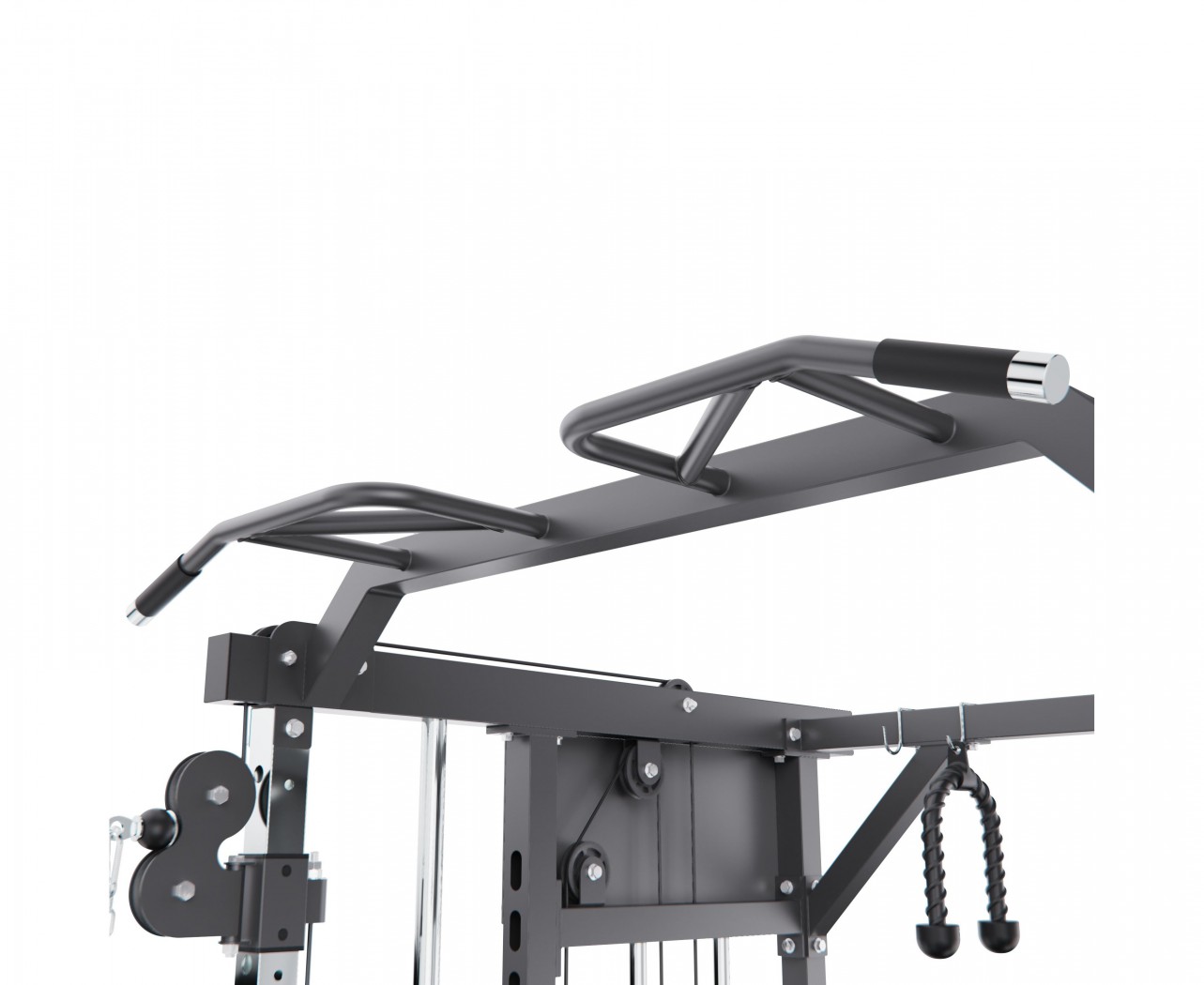 Тренажёр оснащён верхними и нижними блоками, а также набором рукоятей: прямая, V-образная, манжета для ног и дополнительные адаптеры. Система тросов использует тросы длиной 60 см и диаметром 5 мм, оснащённые пружинами и фиксаторами, что обеспечивает плавный ход, точную регулировку нагрузки и долговечность в условиях интенсивной эксплуатации. На стойках расположены держатели для весовых пластин, а встроенный гриф имеет длину 80 см и толщину 5 мм, что обеспечивает удобную загрузку дисков и стабильную работу при выполнении упражнений.