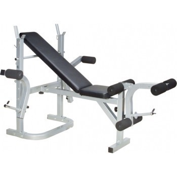 Включает в себя модули: регулируемую наклонную скамью, регулируемый тренажер для ног, тренажер для разводки рук лежа, регулируемую стойку под штангу.