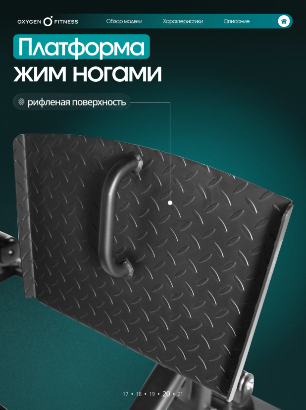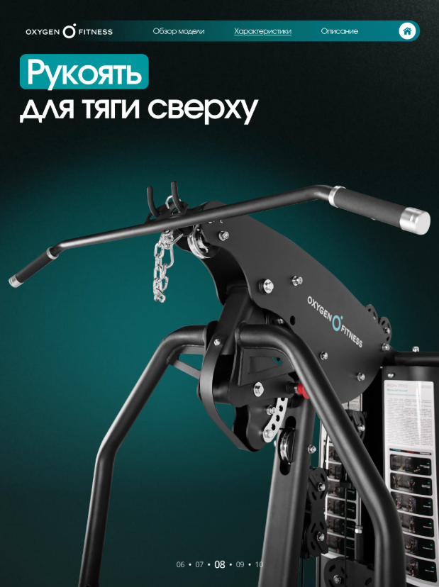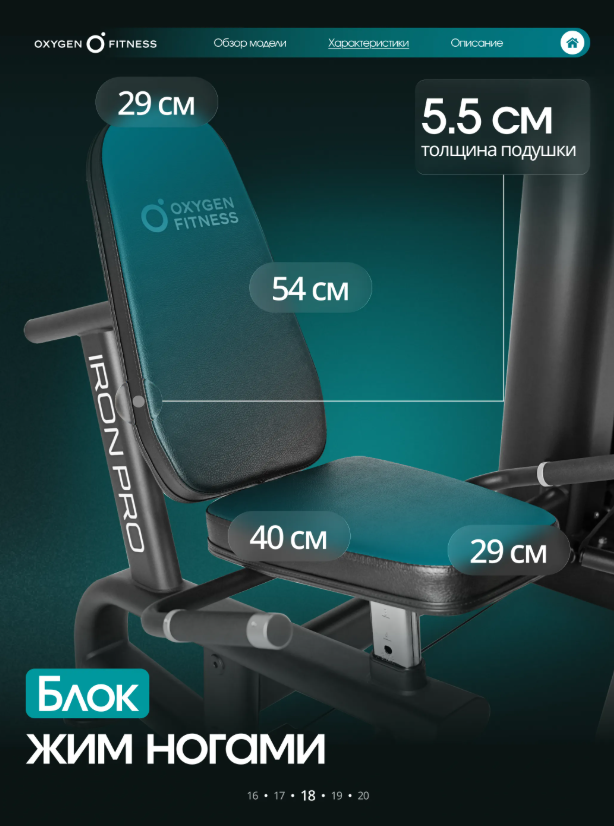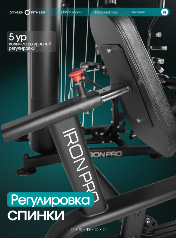 Модель объединяет широкий спектр силовых упражнений и позволяет полноценно прорабатывать основные группы мышц: грудь, спину, плечи, руки и ноги. Благодаря расширенному функционалу и высокой надежности станция отлично подходит как для домашнего использования, так и для фитнес-студий, корпоративных залов и небольших спортивных клубов. Усиленная конструкция для интенсивных тренировок Основу тренажера составляет прочная стальная рама из профиля 50 ×70 ммс толщиной стенки2 мм, обеспечивающая высокую жесткость и устойчивость при любых нагрузках. Значительный вес конструкции327 кггарантирует стабильность тренажера даже при выполнении динамичных силовых упражнений. Мультистанция рассчитана на пользователей весом до150 кг, что делает ее надежным оборудованием для регулярных и интенсивных тренировок. Эффективная грузоблочная система Система нагрузки реализована через грузоблочный стек90 кг, состоящий из 17 композитных плит по5 кг. Это позволяет точно подбирать уровень нагрузки и постепенно увеличивать рабочий вес по мере роста силы и выносливости. Передача усилия осуществляется через прочный стальной трос диаметром5 мм, обеспечивающий плавный ход механизмов, точную передачу нагрузки и долговечность конструкции. Расширенный функционал тренировок Модель IRON PRO отличается расширенными возможностями тренировок, включая модуль жима ногами, который значительно увеличивает вариативность упражнений и позволяет эффективно прорабатывать мышцы ног и ягодиц. Тренажер позволяет выполнять множество упражнений на: грудные мышцы, спину, плечевой пояс, руки, мышцы ног. Таким образом, один комплекс способен заменить сразу несколько силовых тренажеров. Эргономика и комфорт Особое внимание уделено удобству пользователя. Сиденье и спинка имеют эргономичную форму и выполнены с использованием PU-поролона высокой плотности, обеспечивающего комфорт и правильную поддержку тела. Обивка из износостойкой экокожи устойчива к интенсивной эксплуатации и легко очищается. Размеры подушек: спинка — 54 × 29 ×5,5 смсиденье — 40 × 29 ×5,5 смвалики — диаметр13 смТочная настройка под пользователя Для удобства пользователей разного роста и уровня подготовки предусмотрена система регулировок: рукоятки — 7 уровней спинка — 5 уровней сиденье — 5 уровней по высоте блок жима от груди — 10 уровней спинка блока жима ногами — 5 уровней Такая гибкость настройки обеспечивает правильную биомеханику движений и повышает эффективность каждой тренировки. Оптимальные размеры Несмотря на расширенный функционал, тренажер сохраняет удобные габариты для размещения в фитнес-пространстве: длина —210 смширина —202 смвысота —220 см OXYGEN FITNESS IRON PRO — это универсальная силовая станция с расширенным функционалом и профессиональной надежностью. Она объединяет высокую прочность конструкции, плавную работу механизмов и комфортную эргономику, позволяя проводить полноценные силовые тренировки на одном тренажере.
