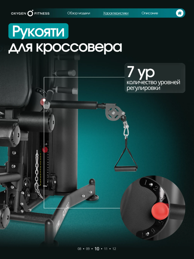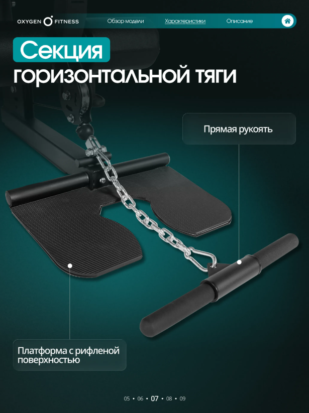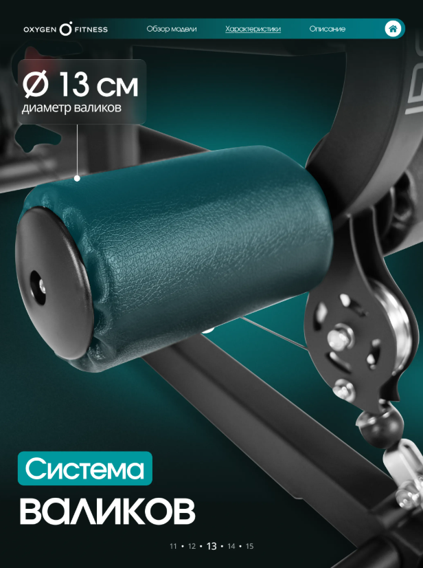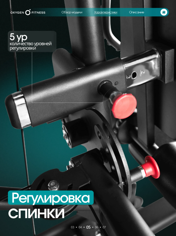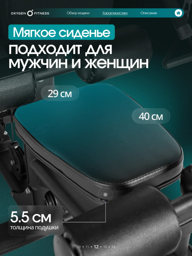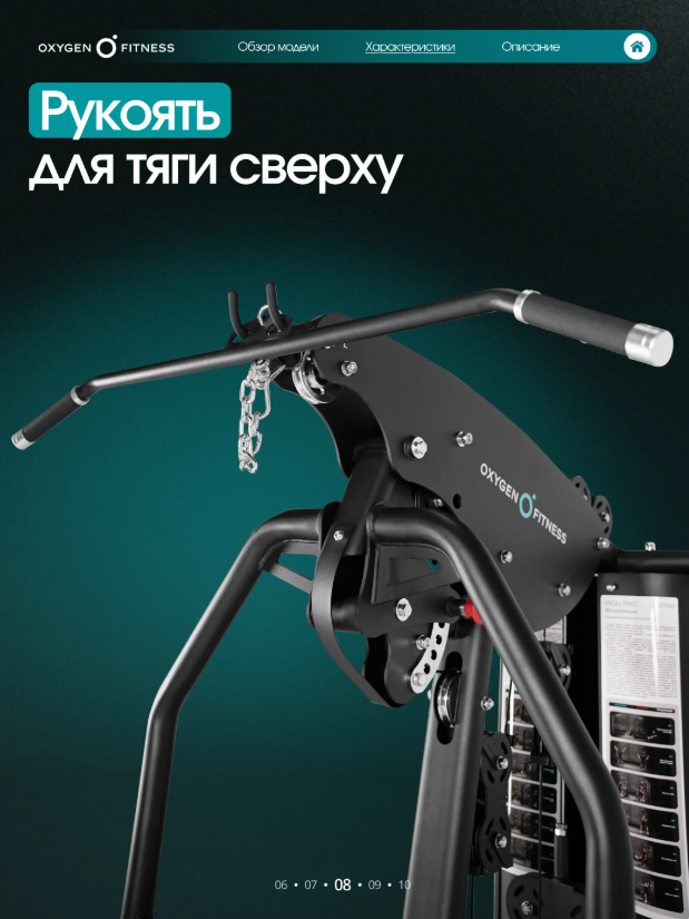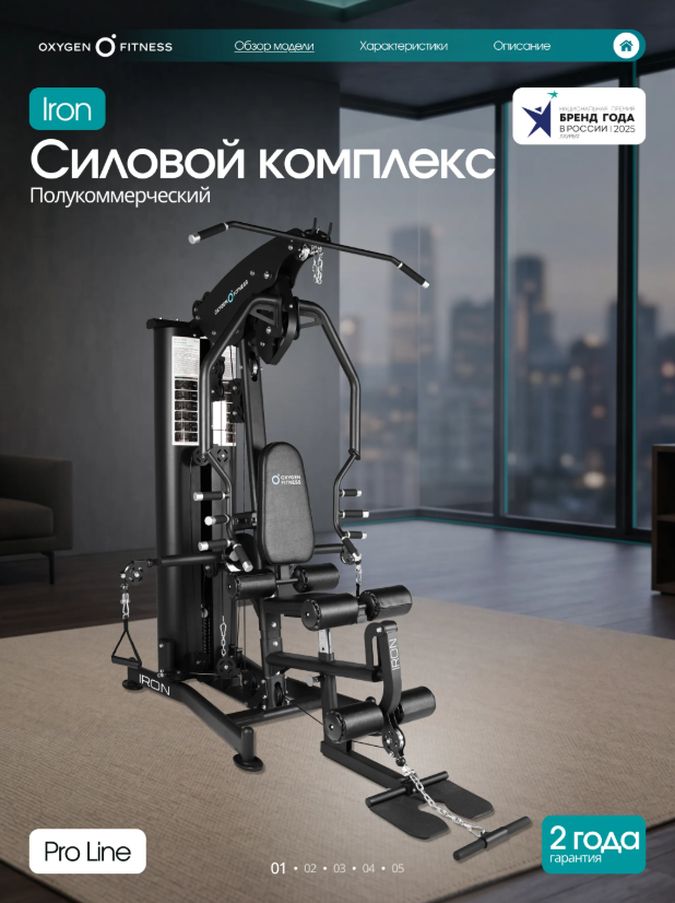 Тренажер рассчитан на полукоммерческое использование, поэтому одинаково хорошо подойдет как для домашнего фитнес-пространства, так и для корпоративных залов, фитнес-студий и небольших тренажерных клубов. Максимальная надежность конструкции Основу тренажера составляет усиленная рама из стального профиля 50 ×70 ммс толщиной стенки2 мм, обеспечивающая высокую жесткость и устойчивость при интенсивных нагрузках. Общий вес конструкции248,6 кгделает тренажер максимально стабильным и безопасным даже при динамичных упражнениях. Мощная грузоблочная система Силовая нагрузка реализована через грузоблочный стек90 кг, состоящий из 17 композитных плит по5 кг. Такая система позволяет точно подбирать рабочий вес и постепенно увеличивать нагрузку по мере роста силы. Передача усилия осуществляется через стальной трос диаметром5 мм, обеспечивающий плавное и стабильное движение без рывков и лишнего шума. Комфорт и эргономика Каждый элемент станции продуман для максимального удобства пользователя. Эргономичные подушки имеют наполнитель из PU-поролона высокой плотности и долговечную обивку из экокожи, устойчивую к износу и интенсивной эксплуатации. Размеры элементов обеспечивают правильную поддержку тела: • спинка — 54 × 29 ×5,5 см• сиденье — 40 × 29 ×5,5 см• валики — диаметр13 смТочная настройка под пользователя Мультистанция позволяет быстро адаптировать тренажер под рост и тип упражнения благодаря большому количеству регулировок: • рукоятки — 7 уровней • спинка — 5 уровней • сиденье — 5 уровней по высоте • блок жима от груди — 10 уровней Такая гибкость настройки делает тренировку максимально эффективной и безопасной для пользователей разного роста и уровня подготовки. Для интенсивных тренировок Конструкция станции рассчитана на пользователей весом до150 кг, а рабочая нагрузка достигает90 кг, что позволяет выполнять силовые тренировки различной интенсивности — от базовых упражнений до серьезных силовых программ. Габариты Тренажер сохраняет оптимальные размеры для размещения в зале или домашнем фитнес-пространстве: • длина —210 см• ширина —135 см• высота —220 смOXYGEN FITNESS IRON — это надежная силовая мультистанция, которая объединяет функциональность, комфорт и долговечность. Один тренажер заменяет целый комплекс оборудования и позволяет проводить полноценные силовые тренировки, не выходя из дома.