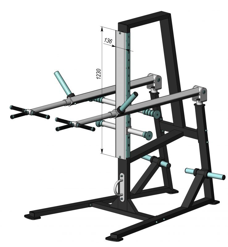Конструкция тренажера включает в себя два независимых рычага, нагружаемые дисками олимпийского стандарта 50 мм.