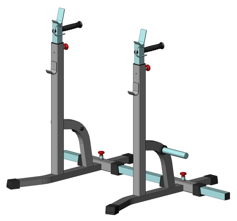 Стойки регулируется по высоте и по ширине. Регулировка по ширине позволяет применять грифы всех типов. Регулировка по высоте предназначена для жима штанги с различными углами и приседаний со штангой.