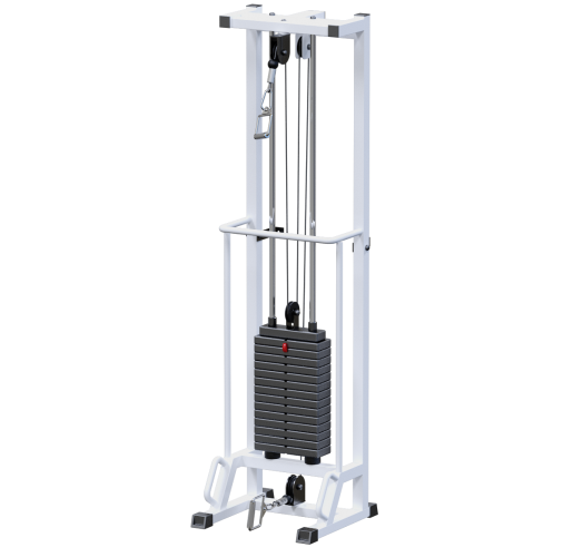 - Грузоблочный стек тренажера состоит из металлических обрезиненных плит весом по 5кг, и хромированных направляющих. Изменение нагрузки происходит при помощи металлической иглы(фиксатора). Для приведения в движение грузов используется трос 5 мм в пвх оплетке с усилием на разрыв 500 кг с максимальной нагрузкой – 800кг.