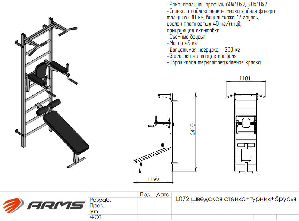 Многофункциональный комплекс Шведская стенка с турником брусьями и скамьёй для пресса ARMS L072-1 спортдоставка