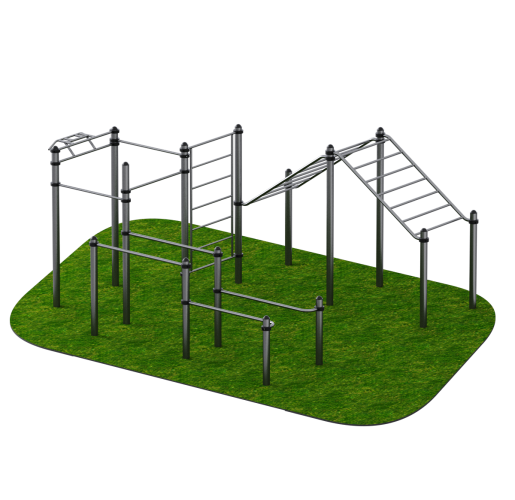 Технические характеристики: Длина – 5465 мм; Ширина – 5122 мм; Высота – 2540мм; Стойки из трубы диаметром 108мм, имеют пластиковые куполообразные заглушки; Перекладины, турник, шведская стенка и перекладины рукохода из трубы диаметром 33мм, толщина стенки 3мм; Брусья и боковые элементы рукохода из трубы диаметром 48мм; Все соединения хомутовые; Травмобезопасная, антивандальная конструкция Порошковая термоотверждаемая краска устойчивая к атмосферному воздействию Стойки-опоры монтируется на глубину не