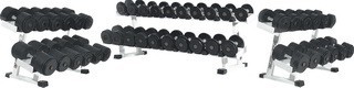 Комплект из трех стоек, на которых размещаются 22 пары гантелей, весом: 3, 4, 5, 6, 7, 8, 9, 10, 12, 14, 16, 18, 20, 22, 24, 26, 30, 35, 40, 45, 50 и 55 кг.