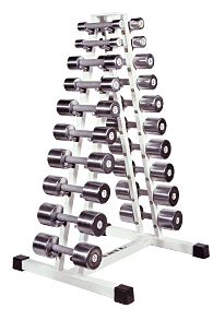 В комплект стойки входят 10 пар хромированных гантелей, весом: 1, 2, 3, 4, 5, 6, 7, 8, 9 и 10 кг.