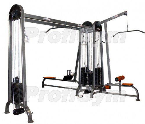 Многофункциональный тренажер ProfiGym – это четырехпозиционная конструкция, включающая 5 стеков и выполняющая функции 4 независимых тренажеров: тренажер для вертикальной тяги (нагрузка – 100 кг); тренажер для горизонтальной тяги (нагрузка – 100 кг); кроссовер с двумя стеками (80 кг каждый); тренажер для развития и проработки трицепсов в положении стоя (нагрузка – 70 кг). Спортивная станция комплектуется рукоятями: для параллельного узкого хвата; широкого хвата; тяги на трицепсы; отдельного хвата каждой рукой (две вращающиеся рукоятки). Допускается одновременная работа нескольких пользователей. ТЕХНИЧЕСКИЕ ХАРАКТЕРИСТИКИ СТАНЦИИ МС-021: Трос с максимальной нагрузкой до 1080 кг (нержавеющая сталь, сечение 6 х 19 мм). Материал рамы – гнутые стальные профили (80х40х3 мм). Закрытые шарикоподшипники не требуют обслуживания. Прорезиненные плитки блочных грузов с двумя фторопластовыми втулками обеспечивают лучшее скольжение и высокую износостойкость. 5 блоков грузов: 1 блок – 70 кг (13 прорезиненных стальных плит 5 кг каждая с 1 дополнительным верхним грузом-флейтой 5 кг); 2 блока – по 80 кг (15 прорезиненных стальных плит 5 кг каждая с 1 дополнительным верхним грузом-флейтой 5 кг); 2 блока по 110 кг (21 прорезиненная стальная плита 5 кг каждая с 1 дополнительным верхним грузом-флейтой 5 кг). Материалы для мягких компонентов оборудования: винилискожа (основа – высокопрочный капрон) и вспененный полиуретан (плотность 140 кг/куб.м). Направляющие: материал – отшлифованная для лучшего скольжения грузов нержавеющая сталь. Опоры тренажера снабжены для лучшего сцепления с полом и гашения вибраций резиновыми подпятниками (толщина 20 мм, диаметр 120 мм). Ножки тренажера могут крепиться к полу, что исключает нежелательное перемещение тренажера по залу. Тренажер окрашен при помощи порошкового электростатического напыления (стандартный цвет – серебристый металлик). Подходит для спортсменов различного роста. Вес – 810 кг; длина 5600 мм, ширина 2600 мм, высота 2630 мм.