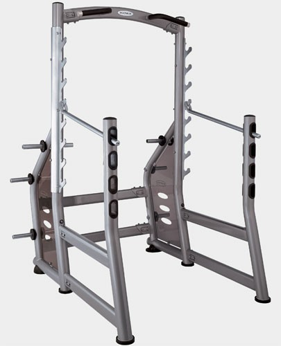 Регулируемая высота верхней страховочной перегородки - от 77 см до 122 см. Нижняя страховочная перегородка на высоте 50 см. Турник. Встроенные подставки под диски. Большой вес конструкции гарантирует устойчивость.