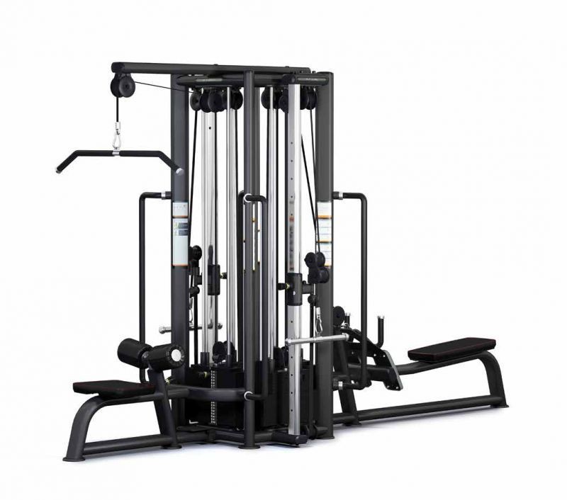 4-х позиционная станция с блочной рамкой – многофункциональный тренажер с неограниченными возможностями тренировки всех основных групп мышц. Тренажер необходим для физической подготовки спортсменов различных видов спорта и очень эффективен при формировании сильного и красивого телосложения. Конструкция тренажера включает четыре независимые станции: блок для тяги с верху, блок для тяги снизу, трицепс станцию и блочную рамку с четырьмя тяговыми блоками - два верхних и два нижних. Блок для тяги с верху имеет регулируемые опорные валики для фиксации ног; блок для тяги снизу имеет регулируемый по высоте направляющий ролик; в конструкции трицепс станции имеется регулируемый валик, обеспечивающий плотную фиксацию ног. При использовании рукояток и приспособлений различной конфигурации возможно выполнение большого числа упражнений. Верхние блоки предназначены для выполнения упражнений: кроссовер, сведение рук перед собой, разгибание рук на трицепс, верхняя тяга, скручивания на пресс. Нижние блоки предназначены для выполнения упражнений: отведение ноги назад, в сторону, перекрестный подъем ног, нижняя тяга, тяга в наклоне, тяга к подбородку, сгибание рук на бицепс, подъемы рук через стороны, перед собой и назад, сведение рук перед собой. В дополнение к блокам, тренажер снабжен перекладиной для выполнения подтягиваний и подъема ног в висе. Тренажер предполагает тренировку четырех-пяти спортсменов одновременно.