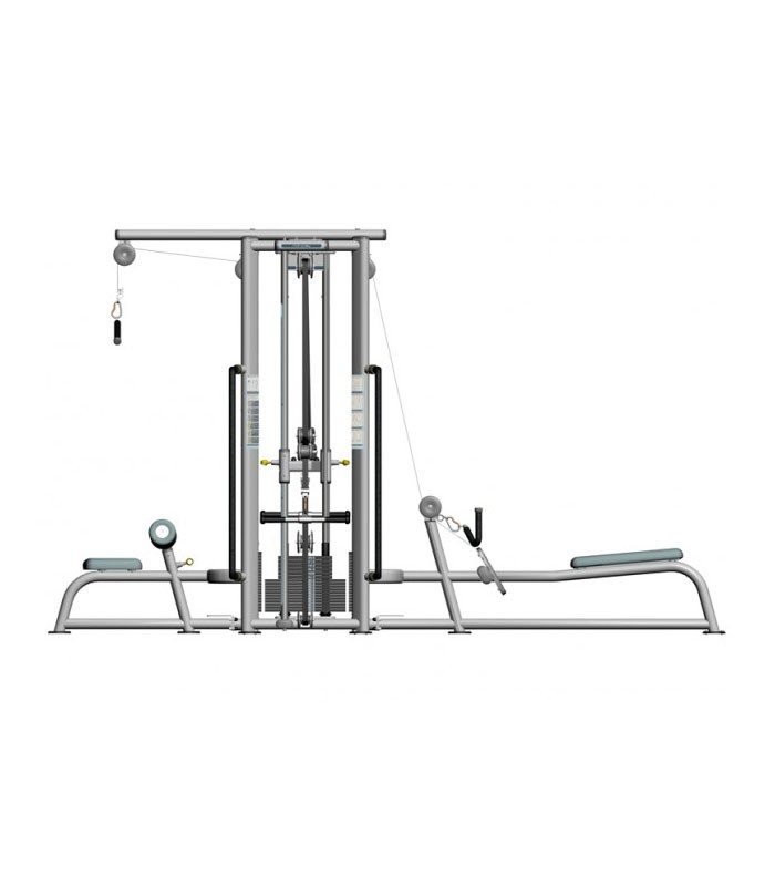 4-х позиционная станция с блочной рамкой – многофункциональный тренажер с неограниченными возможностями тренировки всех основных групп мышц. Тренажер необходим для физической подготовки спортсменов различных видов спорта и очень эффективен при формировании сильного и красивого телосложения. Конструкция тренажера включает четыре независимые станции: блок для тяги с верху, блок для тяги снизу, трицепс станцию и блочную рамку с четырьмя тяговыми блоками - два верхних и два нижних. Блок для тяги с верху имеет регулируемые опорные валики для фиксации ног; блок для тяги снизу имеет регулируемый по высоте направляющий ролик; в конструкции трицепс станции имеется регулируемый валик, обеспечивающий плотную фиксацию ног. При использовании рукояток и приспособлений различной конфигурации возможно выполнение большого числа упражнений. Верхние блоки предназначены для выполнения упражнений: кроссовер, сведение рук перед собой, разгибание рук на трицепс, верхняя тяга, скручивания на пресс. Нижние блоки предназначены для выполнения упражнений: отведение ноги назад, в сторону, перекрестный подъем ног, нижняя тяга, тяга в наклоне, тяга к подбородку, сгибание рук на бицепс, подъемы рук через стороны, перед собой и назад, сведение рук перед собой. В дополнение к блокам, тренажер снабжен перекладиной для выполнения подтягиваний и подъема ног в висе. Тренажер предполагает тренировку четырех-пяти спортсменов одновременно.