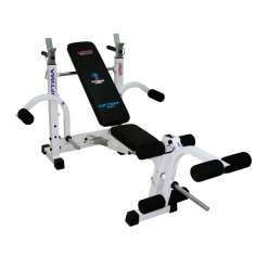 Универсальная скамья предназначена для тренировок со штангой и отягощениями в условиях комнаты (квартиры и т.п.). Скамья многофункциональная предназначена для тренировок на все группы мышц. В состав входит скамейка для жима штанги во всем диапазоне углов, приспособления для мышц груди, бицепса и ног. Стойки для жима штанги регулируются по высоте, имеют замки против сваливания грифа и дополнительные страховочные крюки. Регулировка по высоте позволяет приседать и жать штангу под различными углами. Допустимо применять штангу тренировочную длиной 1600...1800 мм. Спинка регулируется в диапазоне углов от -30° до 90° путем смены положения упора. Сидение регулируется в трех положениях. Скамейка складная. В комплект также входит два типа приставок.