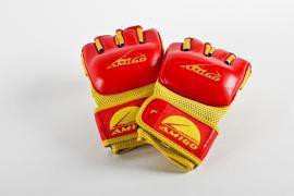 Перчатки для ММА AMIGO из натуральной кожи для соревнований. Открытая ладонь и открытые пальцы обеспечивают удобный хват. Имеется отделение для большого пальца. Наполнение ударной зоны из высокоплотной формованной пены IN-FOAM. На запястье для вентиляции предусмотрена сетка. Фиксацию обеспечивает ремень «Dual Lock» на липучке. Окантовка полиэстером контрастных цветов.