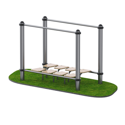Опорные столбы тренажёра изготовлены из стальной трубы диаметром 108 мм и оснащены сферическими пластиковыми заглушками, повышающими травмобезопасность и защищающими конструкцию от воздействия внешней среды. Поручни выполнены из круглой трубы диаметром 42 мм, что обеспечивает удобный и надёжный хват.