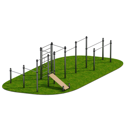 Комплекс объединяет несколько функциональных элементов, позволяя выполнять широкий спектр упражнений на развитие силы, выносливости и координации. Перекладины предназначены для подтягиваний различными хватами, что способствует укреплению широчайших мышц спины, грудных мышц, бицепсов и трицепсов. Брусья из трубы диаметром 43 мм позволяют выполнять отжимания и статические элементы, эффективно развивая мышцы верхнего плечевого пояса.