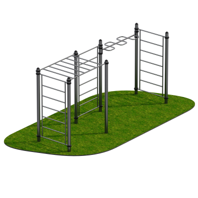 Перекладины изготовлены из трубы диаметром 34 мм и крепятся к стойкам при помощи стальных хомутов, обеспечивающих жёсткость соединений и устойчивость к динамическим нагрузкам. Такая система крепления гарантирует долговечность эксплуатации даже при активном использовании в общественных пространствах.