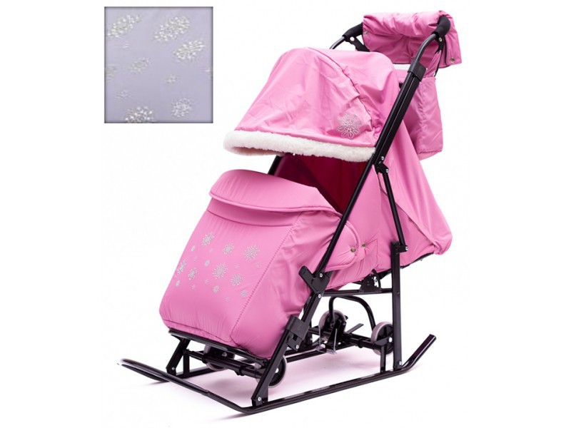 Tкань мембранная "Prinс", 3 положения спинки, спинка жесткая, 4 колеса, складной механизм, накидка на ноги, сумка для мамы, Муфта (М), декоративная отделка, рисунок со стразами, внутри мех 50% шерсть-овечий чес; 50% полиэстер, полозья 30мм, перекидной толкатель на две стороны, выкатные колеса.