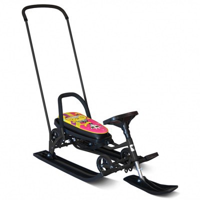 Детская игрушка и транспортное средство повышенной проходимости: снегокат с колёсной базой. Ручка- толкатель позволяет управлять самокатом и видеть ребёнка, потому что он сидит спереди. Выгнутая спинка с ремнём безопасности обеспечивает надёжную фиксацию ребёнка во время движения. Колёсная база поможет легко преодолеть участки без снега. Характеристика: родительская Т-образная съёмная ручка складная эргономичная спинка с мягким покрытием поролоновое сиденье с верхом из искусственной кожи ремень безопасности буксировочный трос: верёвка колёсная база в комплекте тормоз, который можно установить при съёме колес морозостойкие пластиковые лыжи и руль надёжная стальная рама, проходящая двойную ступень контроля Размеры ДхШхВ: 110 х 49 х 30 см сиденье: 44,5 х 20 см высота по сиденью: 30 см высота по родительской ручке: 95 см Вес: 9 кг Максимальная нагрузка на лыжах: 100 кг Максимальная нагрузка на колёсах: 25 кг