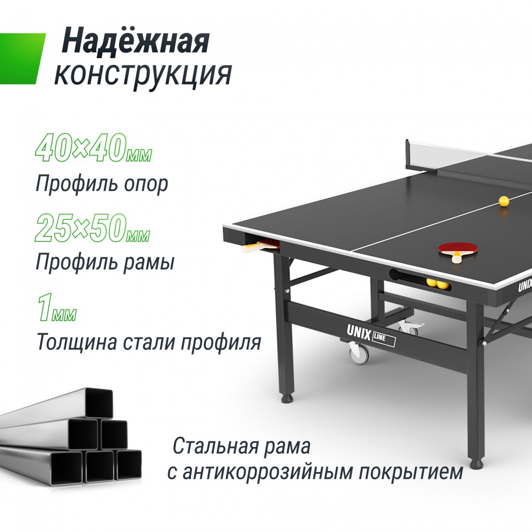 Стол оснащен надежной системой фиксации и тяжелыми ножками, что обеспечивает отличную устойчивость даже при сильном ветре или во время активных игр. Одну из сторон столешницы можно поднять для одиночной игры. Кроме того, наличие колесиков делает его перемещение простым и удобным.