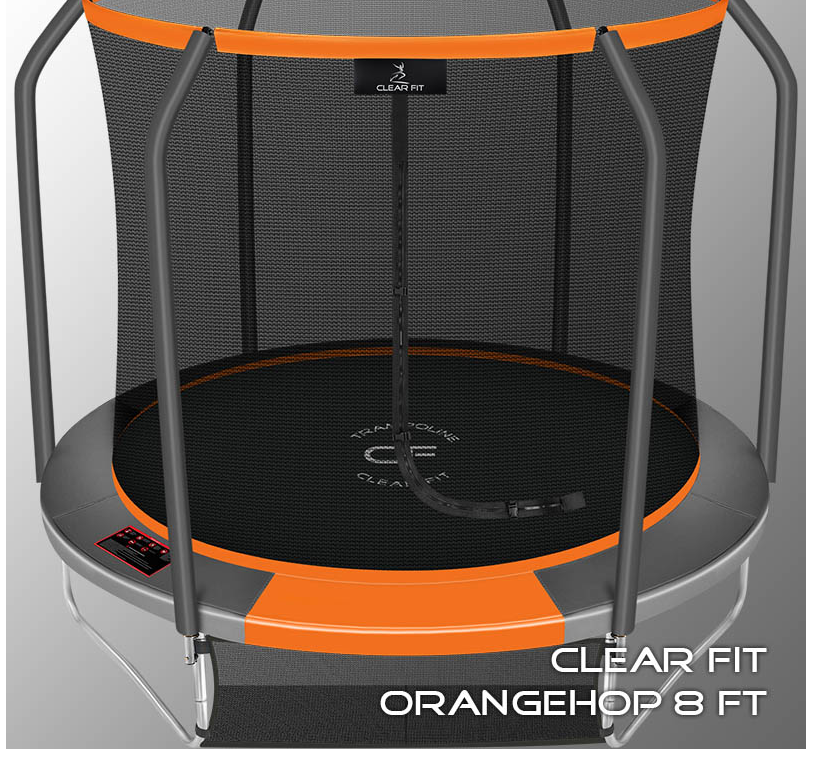 В 2026 году представлена обновленная линейка с улучшенной конструкцией каркаса. Усиление достигнуто за счет использования прочных Т-образных кронштейнов из металла толщиной 1.9 мм. Кроме того, в комплектацию добавлен карман для обуви. Каркасный батут с защитной сеткой Clear Fit серии OrangeHop — отличаются комфортом и надежностью. Надежная рама из качественных комплектующих, прочная защитная сеть снабжена прямым креплением к прыжковому полотну и дополнительной защитой входа, наверху каркасное жесткое крепления, сеть не провисает и не слетает во время тренировок. Увлекательный, полезный и безопасный тренажер для всей семьи. Батуты серии OrangeHop 6Ft и 8Ft поставляются в оптимальной для комфорта и безопасности комплектации: батут, верхняя защитная сеть, защитный мат и карман для обуви. Размер батута 8 футов с прыжковой поверхностью 2.015 м легко разместить на любом участке, он подойдет и для детских игр, и для тренировок. Верхняя защитная сеть оберегает от падений, усиленная молния и дополнительная защита входа уберегут малышей от случайного входа или падения. Надежный каркас из гальванизированной стали, качественные комплектующие и погодостойкие метизы рамы делают батут безопасным, устойчивым, надежным, гарантируют полную защиту от коррозии и долгий срок службы. Максимальный вес пользователя батута OrangeHop 8Ft — до 160 кг.