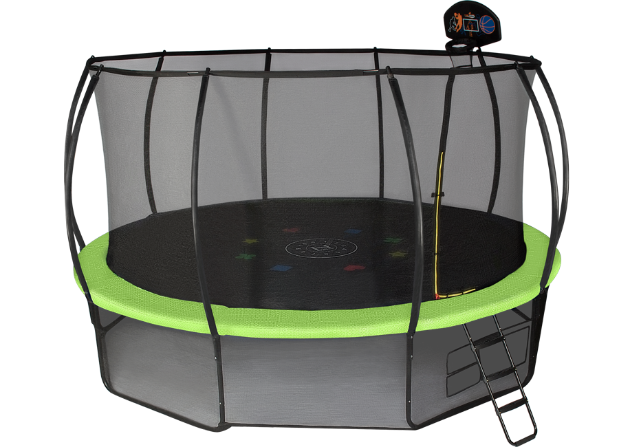 | Комплектация | рамная конструкция, защитный мат, защитная сеть, нижняя защитная сеть, лестница, баскетбольное кольцо, мяч, насос |
