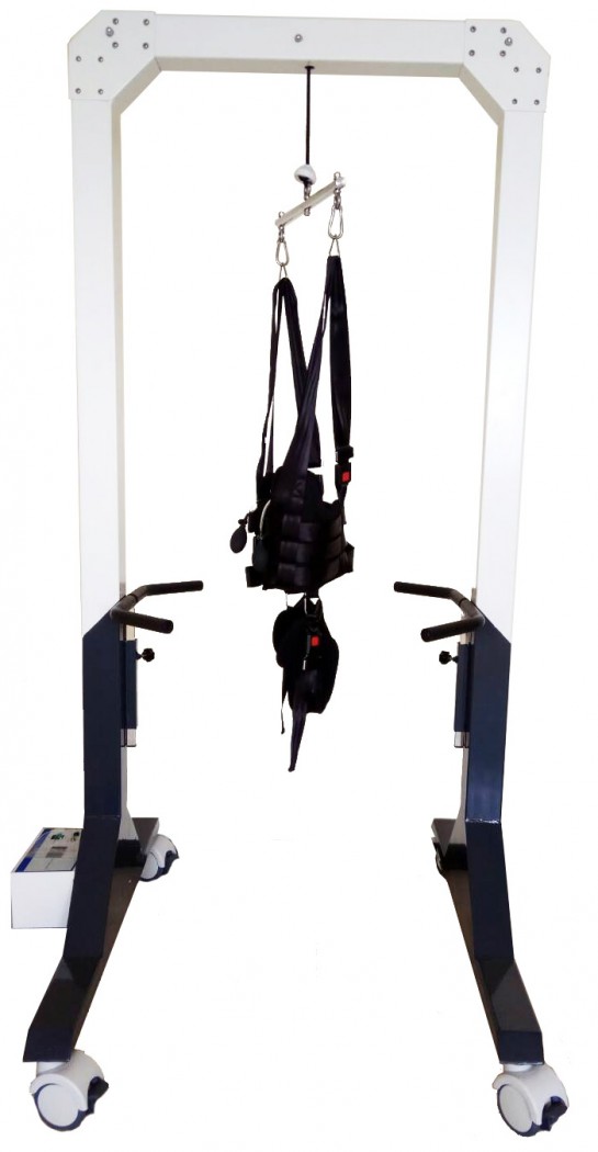 - Подвес оснащен электроприводом для разгрузки веса пациента. С его помощью на ноги и позвоночник тренирующегося можно снизить или полностью избавить от тяжести собственного веса.