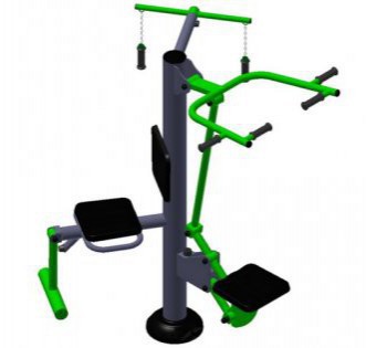 Описание Габаритные размеры: 1500×1400×1900 мм Зона безопасности: 3400×3500 мм Назначение: тренировка и укрепление мышц рук, ног и спины Принцип использования тренажера Подтягивание Занимающийся в сидячем положении держится за верхние рукоятки и тянет их на себя, затем опускается вниз. Возможно выполнение упражнения широким хватом. Флекс Принцип действия заключается в том, что пользователь в сидячем положении, поставив передние части стоп под специальный валик, выполняет упражнение, разгибая и сгибая ноги в коленях. Тяга Пользователь берется за рукоятки и поочередно тянет вниз сначала одну, затем другую рукоятку.